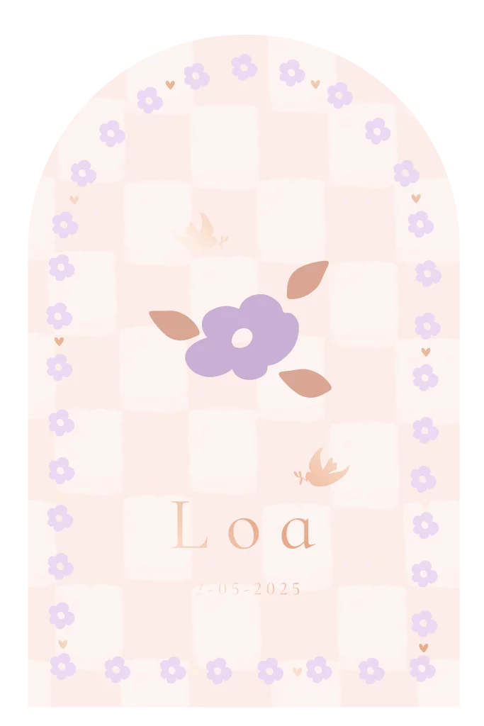 Wanneer je op zoek bent naar een origineel geboortekaartje voor je kindje, is deze stansvormige boog kaart met een illustratie van bloemetjes met ruitjes achtergrond en bloemen een perfecte keuze.