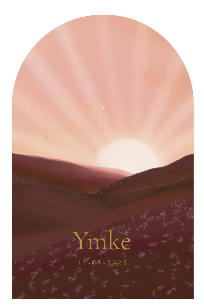 Wanneer je op zoek bent naar een origineel geboortekaartje voor je kindje, is deze stansvormige boog kaart met een illustratie van een zon en landschap met goudfolie stipjes en tekst een perfecte keuze.