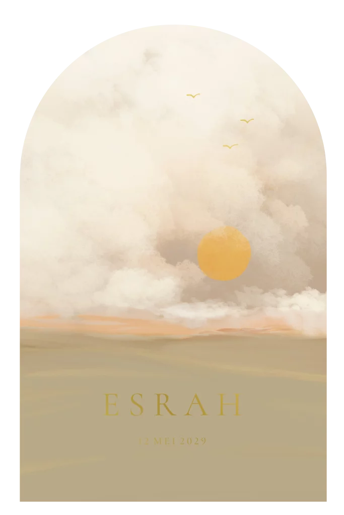 Wanneer je op zoek bent naar een origineel geboortekaartje voor je kindje, is deze stansvormige boog kaart met een illustratie van een zon en landschap.