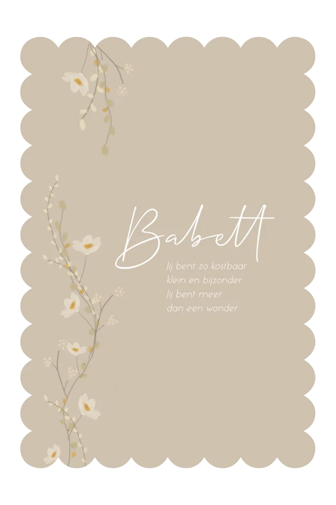 Op zoek naar een uniek geboortekaartje voor je kleintje? Dan is de stansvormige golvende randjes kaart met een prachtige watercolor tekening van bloemen in een slinger vorm precies wat je zoekt. Deze exclusieve geboortekaart straalt een klassieke en romantische sfeer uit, perfect voor ouders die op zoek zijn naar iets anders dan het traditionele aanbod. De rustige en beige tinten geven de kaart een rustgevende uitstraling, terwijl de bloemen en het kader een vleugje originaliteit toevoegen.