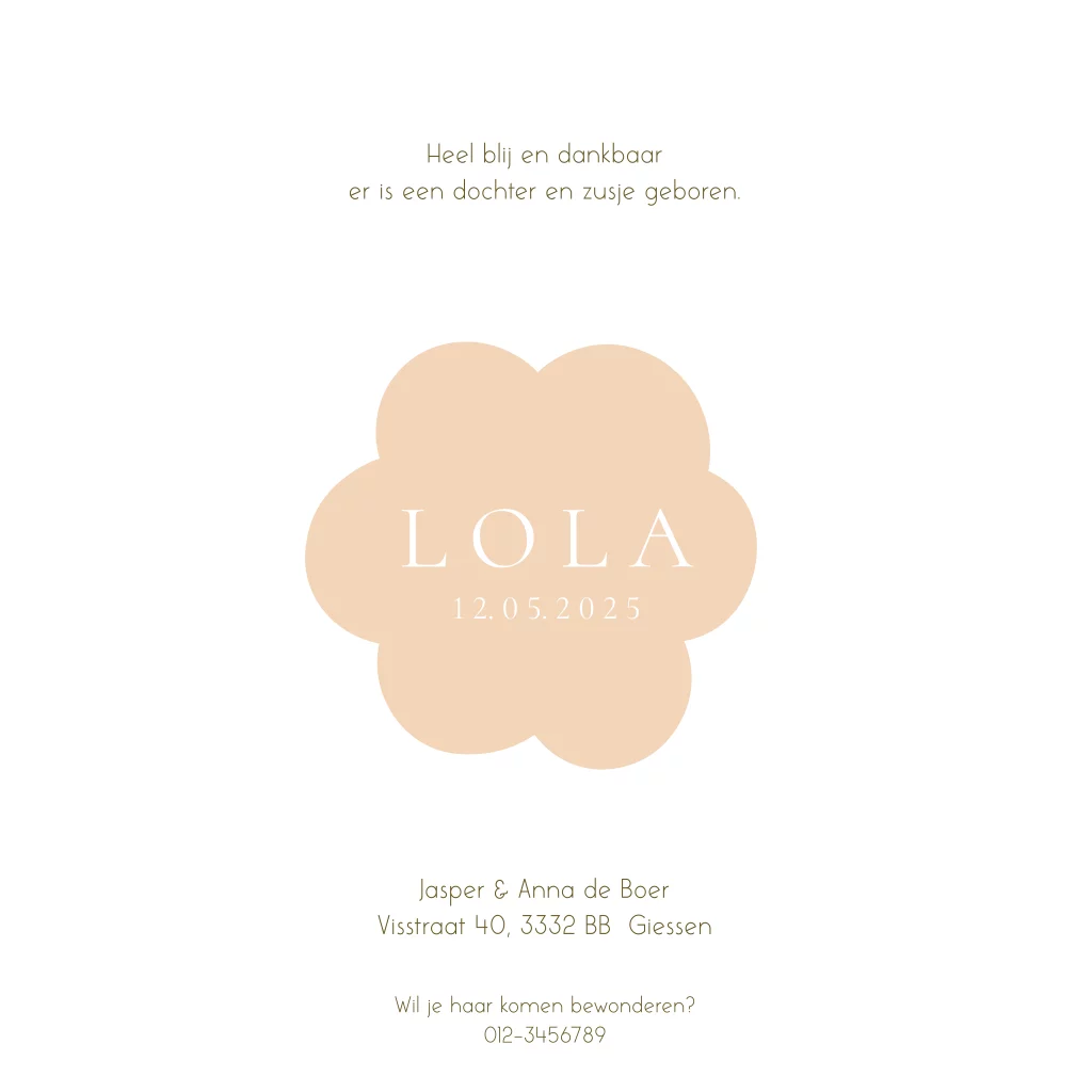 Een mooi vrolijk geboortekaartje met een stans bloem.