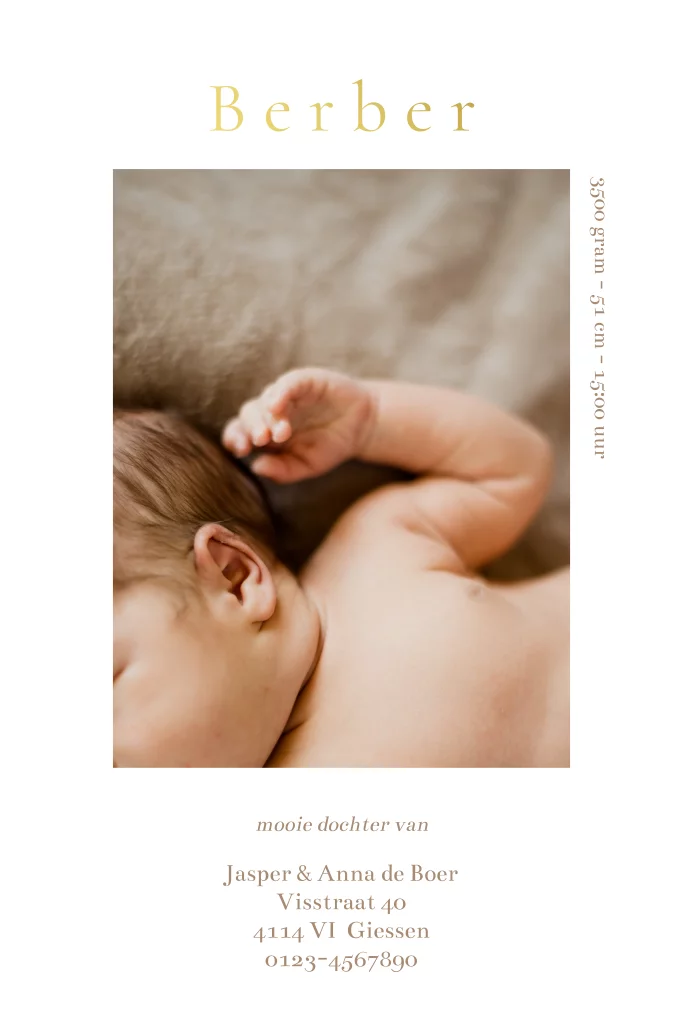 Een mooi geboortekaartje met stans boog en de mogelijkheid voor een eigen foto en goudfolie. Van dit patroon is er ook een wiegje te koop bij www.pienibaby.nl