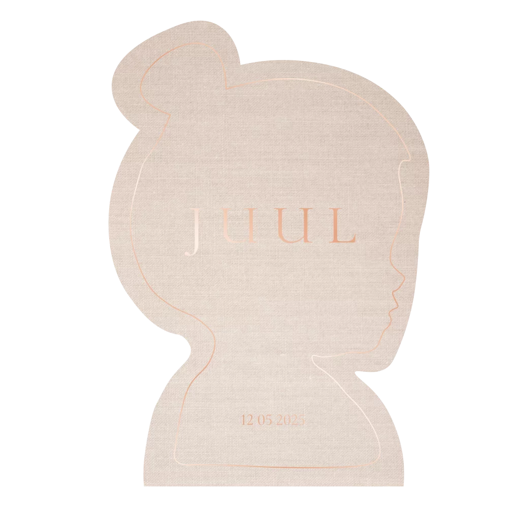 Een mooi uniek geboortekaartjein een gestanste vorm van een baby meisjes hoofd, met een linnenlook achtergrond.