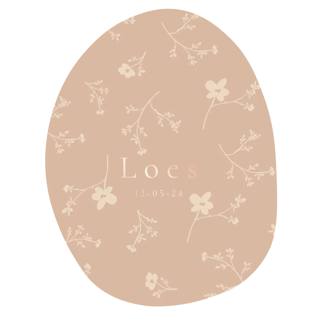 Een mooi ovaal vorm geboortekaartje met takjes en bloemetjes en rosegoudfolie. Van dit ontwerp is er ook behang te koop bij www.bibelotte.nl