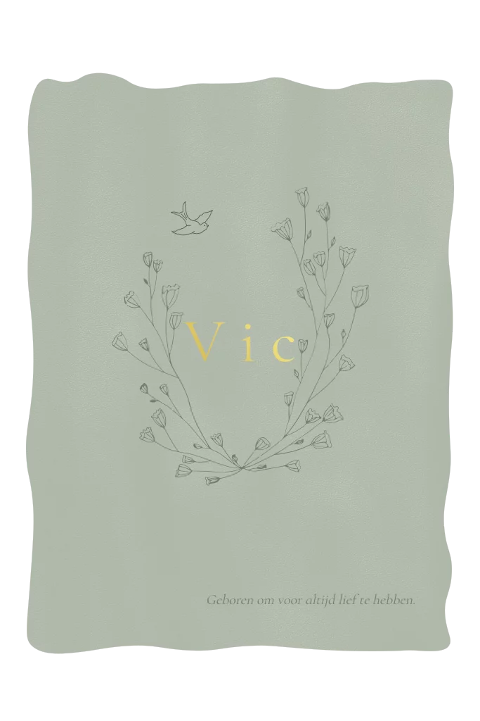 Een mooi minimalistische geboortekaartje met takjes en bloemen en een vogeltje. De kaart heeft een golvende rand.