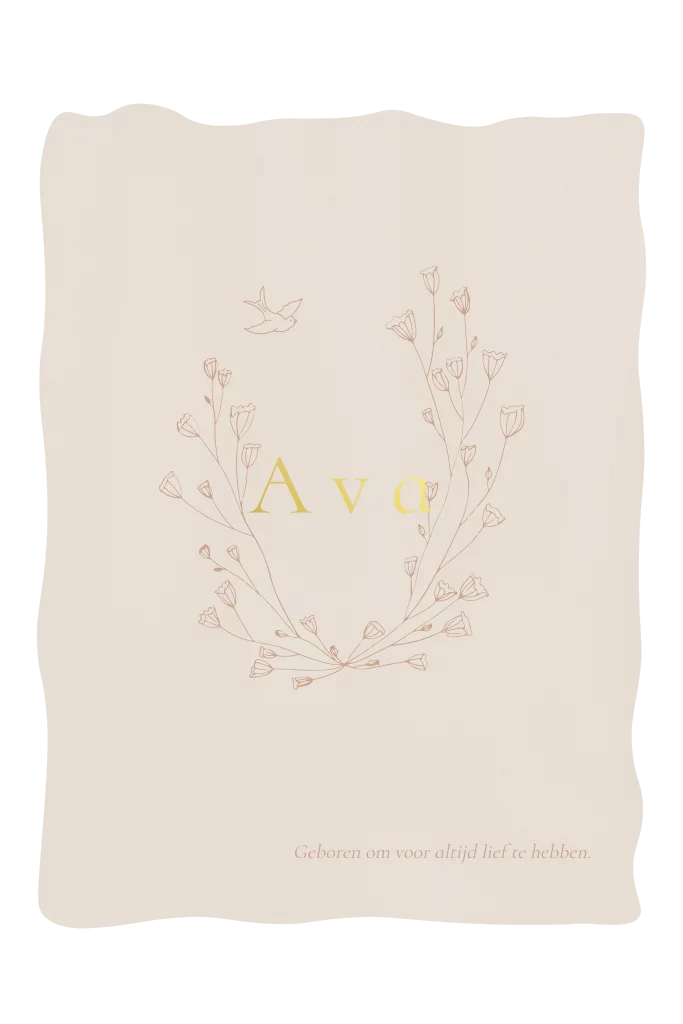 Een mooi minimalistische geboortekaartje met takjes en bloemen en een vogeltje. De kaart heeft een golevnde rand.