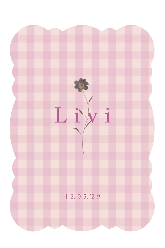 Een mooi geboortekaartje met een ruit achtergrond, in vrolijke kleuren met bloemen en takjes.