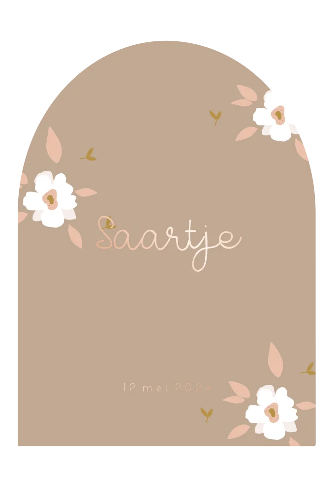 Een leuk geboortekaartje in een boog vorm met bloemen en roségoud folie.