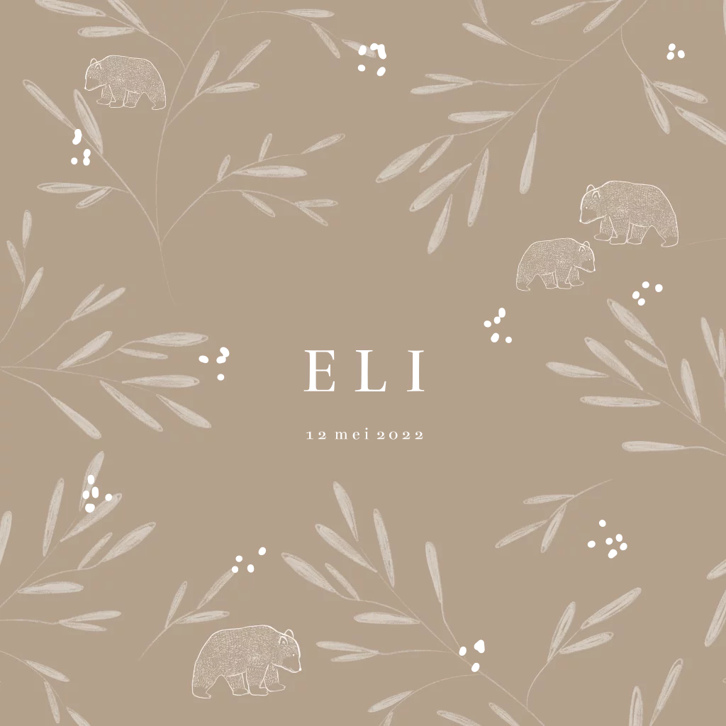 Een lief geboortekaartje met foliedruk in natuur tinten met takjes en beertjes. Kleuren kunnen gewijzigd worden.