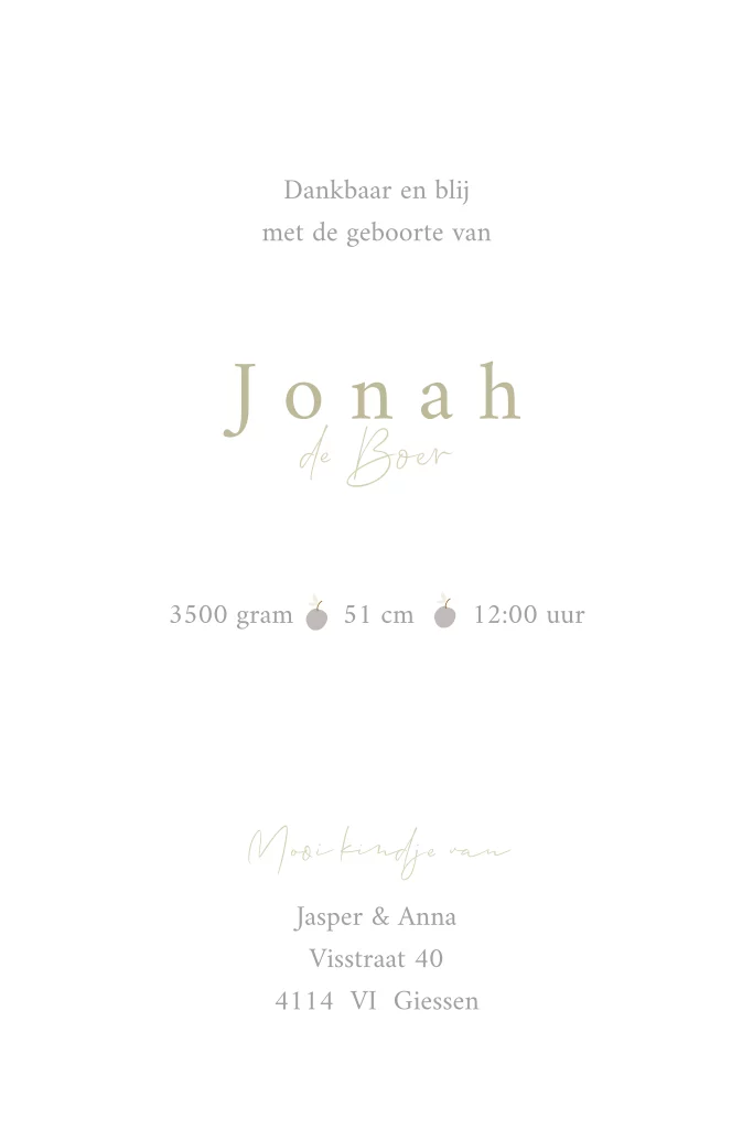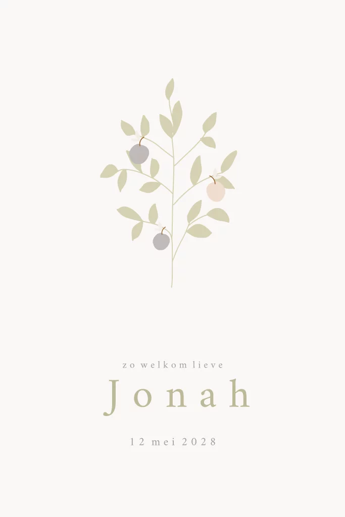 Op zoek naar een uniek geboortekaartje om de komst van jullie kindje aan te kondigen? Ontdek ons prachtige geboortekaartje boom appeltjes! Dit bijzondere kaartje is voorzien van een schattig boompje met kleurrijke appeltjes, waarmee elk gezinslid symbolisch wordt weergegeven. Jullie kunnen zelf de tekst en kleuren aanpassen, zodat het kaartje perfect aansluit bij jullie wensen.