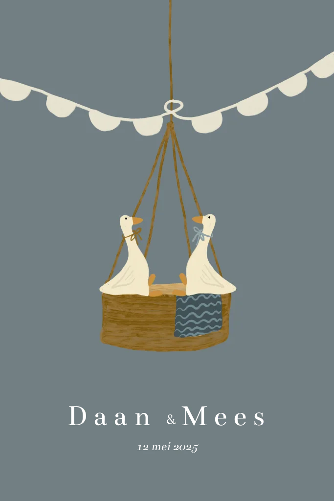 Een mooi hip geboortekaartje voor een tweeling met een verf look en goudfolie. Een mooie tekening van een hangwieg en een gans. Achtergrond kleur kan gewijzigd worden.