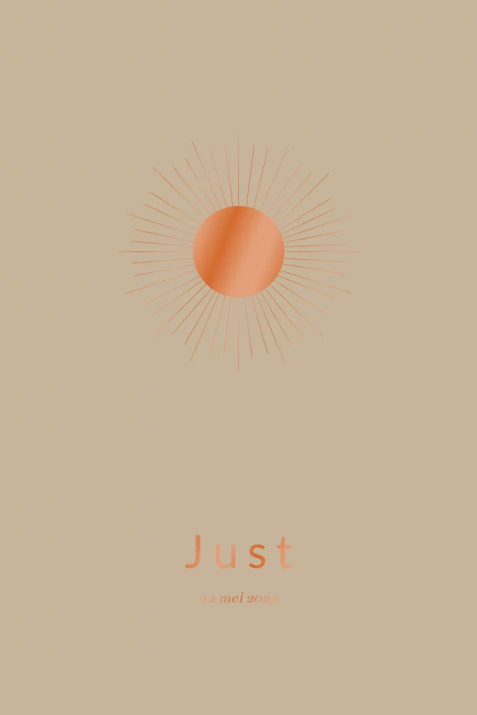 Een mooi minimalistisch geboortekaartje met koper kleurig spot UV en met een zon.