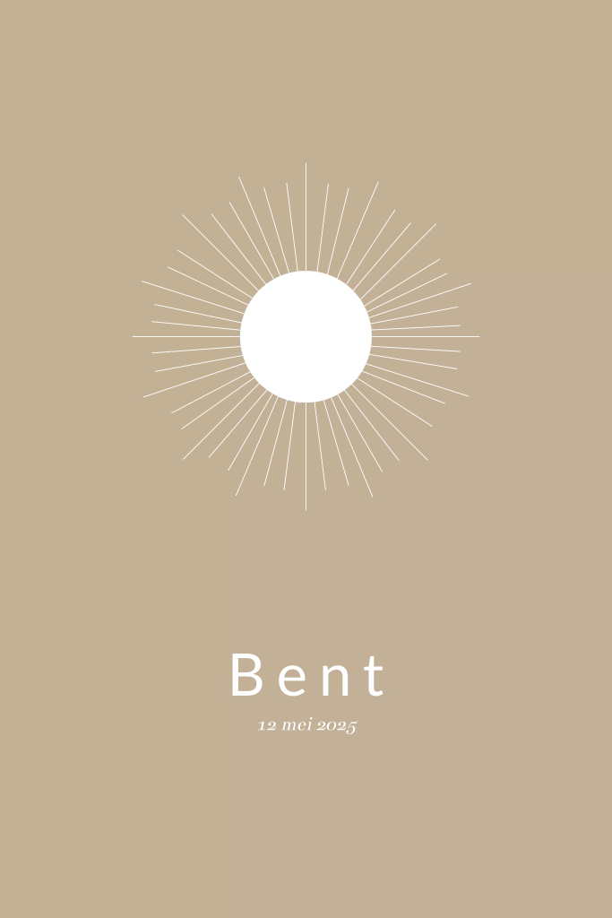 Een mooi minimalistisch geboortekaartje met foliedruk, met een zon. Teksten en kleuren kan je wijzigen.