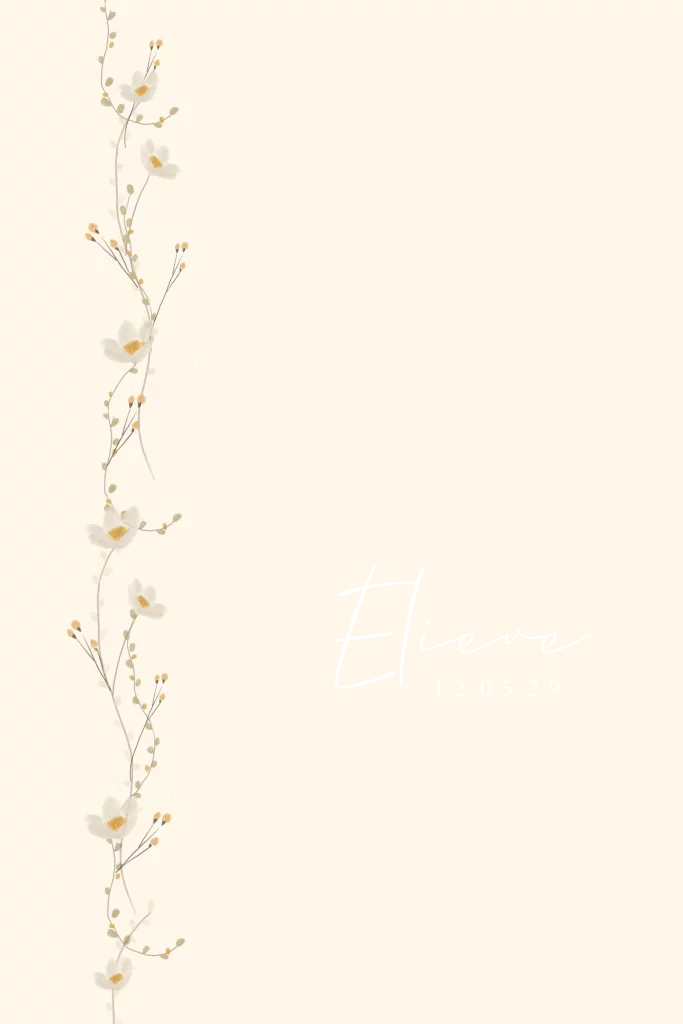 Een lief geboortekaartje met zachte bloemetjes die in een slinger over de kaart staan.