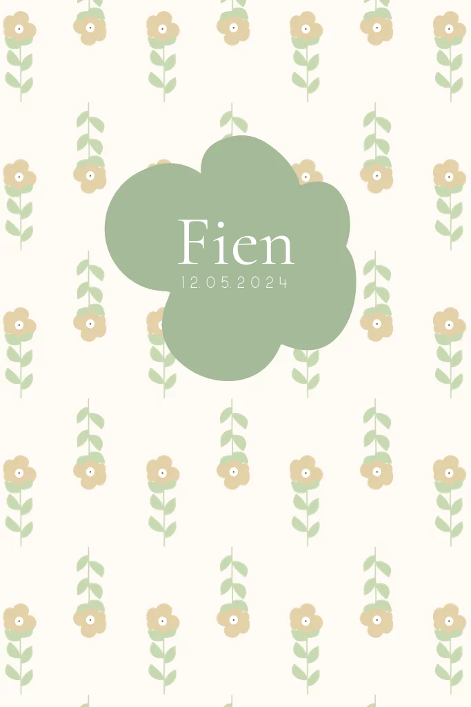 Een lief geboortekaartjes groen en nude tinten met een patroon van bloemetjes in retro stijl. Van deze bloem is er ook behang te verkrijgen bij www.bibelotte.nl.