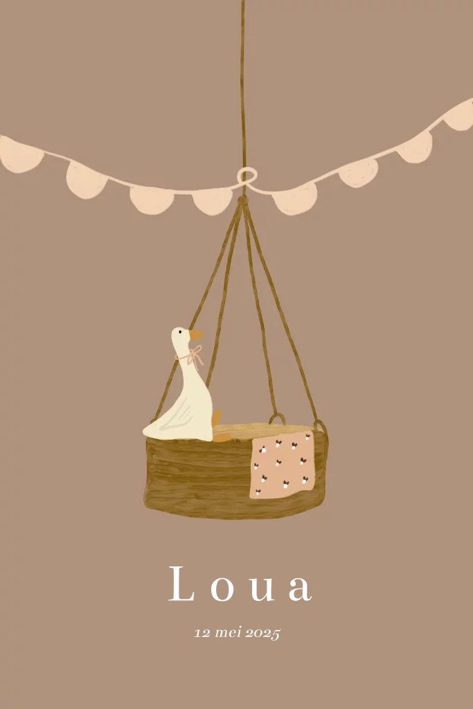 Een mooi hip geboortekaartje met een verf look en goudfolie. Een mooie tekening van een hangwieg en een gans. Achtergrond kleur kan gewijzigd worden.