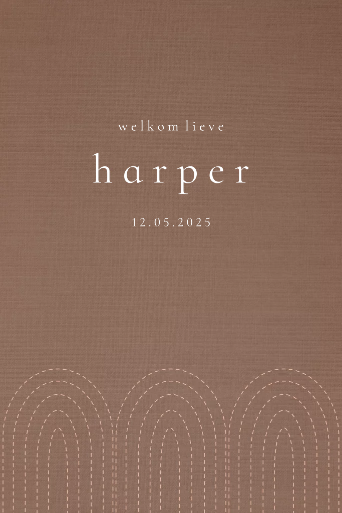 Een mooi geboortekaartje met een linnenlook achtergrond. De bogen en alle teksten kunnen gewijzigd worden van kleur.