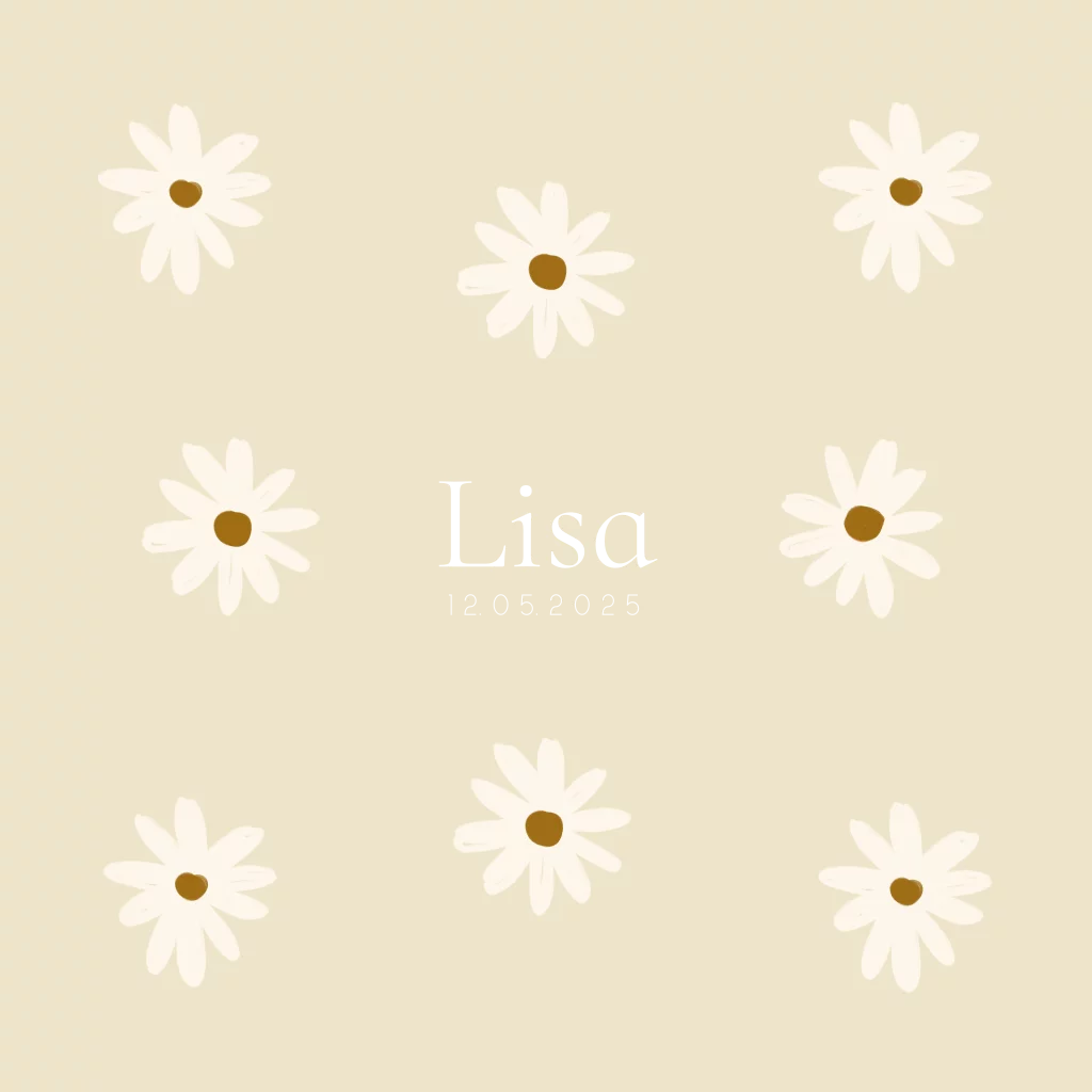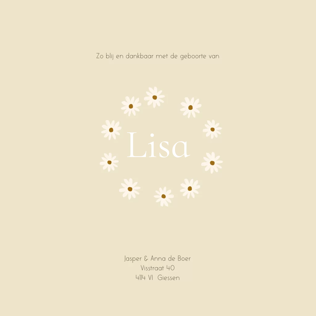 Een leuk en lief geboortekaartje met madeliefjes en foliedruk. Kleuren en tekst kan gewijzigd worden.