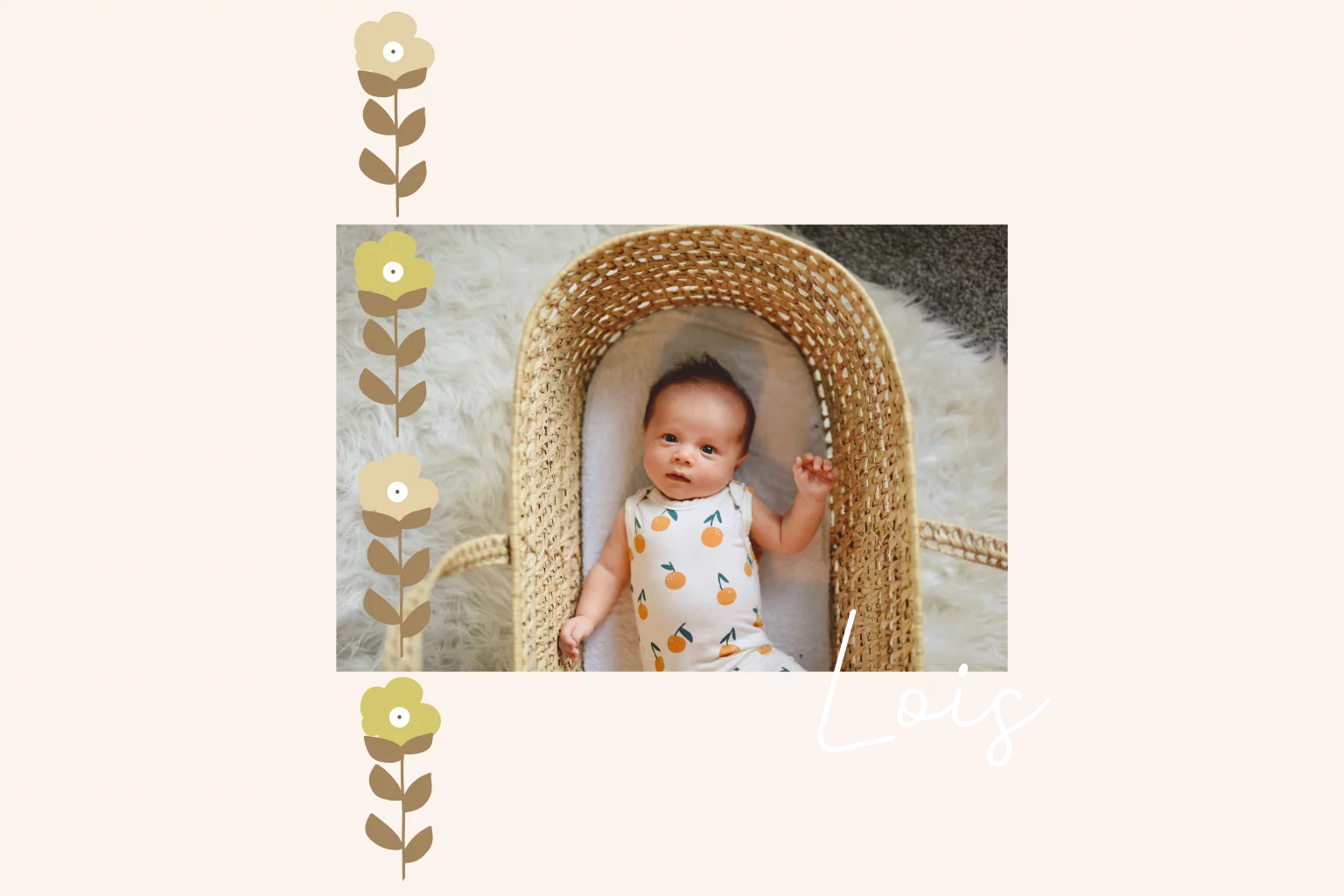 Een heel eenvoudig geboortekaartje met bloemetjes en foliedruk.