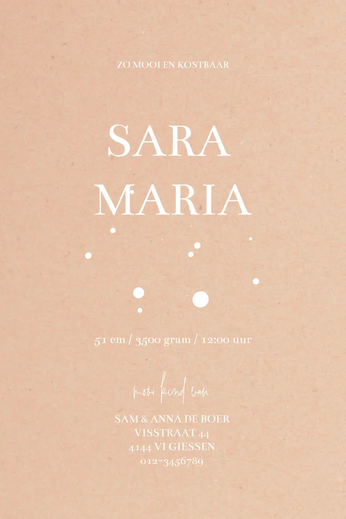 Een mooi vrolijk geboortekaartje met echt goudfolie stippen en aan de binnenkant een kraft look achterkant.