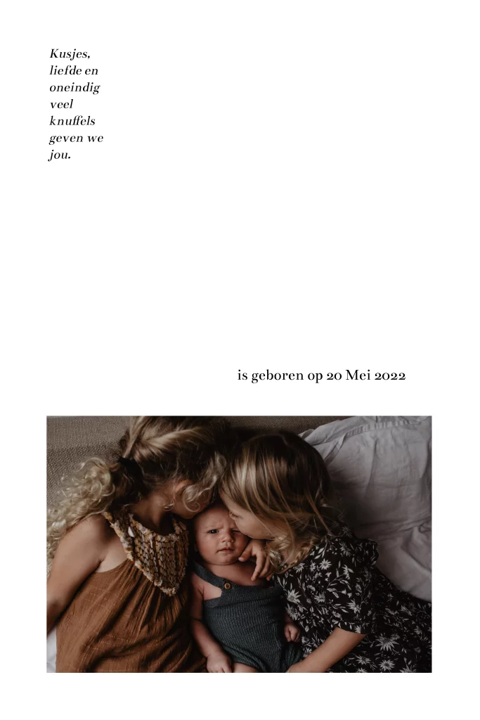 Een lief geboortekaartjes met de naam in goudfolie. Verander de foto en je hebt een uniek geboortekaartje. Tip: gebruik mooie warme kleuren qua kleding voor de foto.