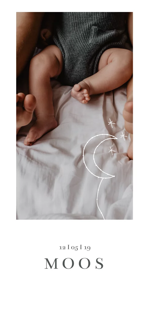 Een hip en trendy geboortekaartje met een slinger maan en sterretjes. De tekst en kleuren kunnen worden aangepast en de foto kan gewijzigd worden.