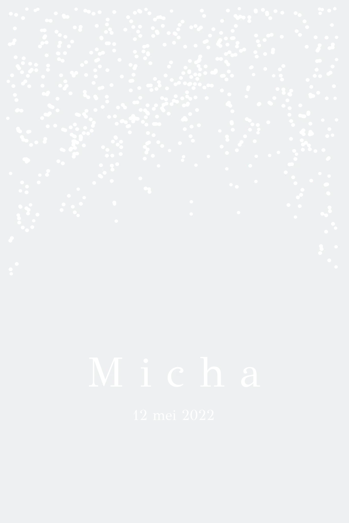 Een heel vrolijk geboortekaartje met een stipjes regen. De naam en de stipjes worden gedrukt in zilver folie. Dit kan je zelf wijzigen naar een andere kleur.
