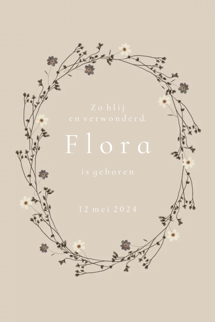Een mooi geboortekaartje met een krans van takjes en lieve kleine bloemetjes.