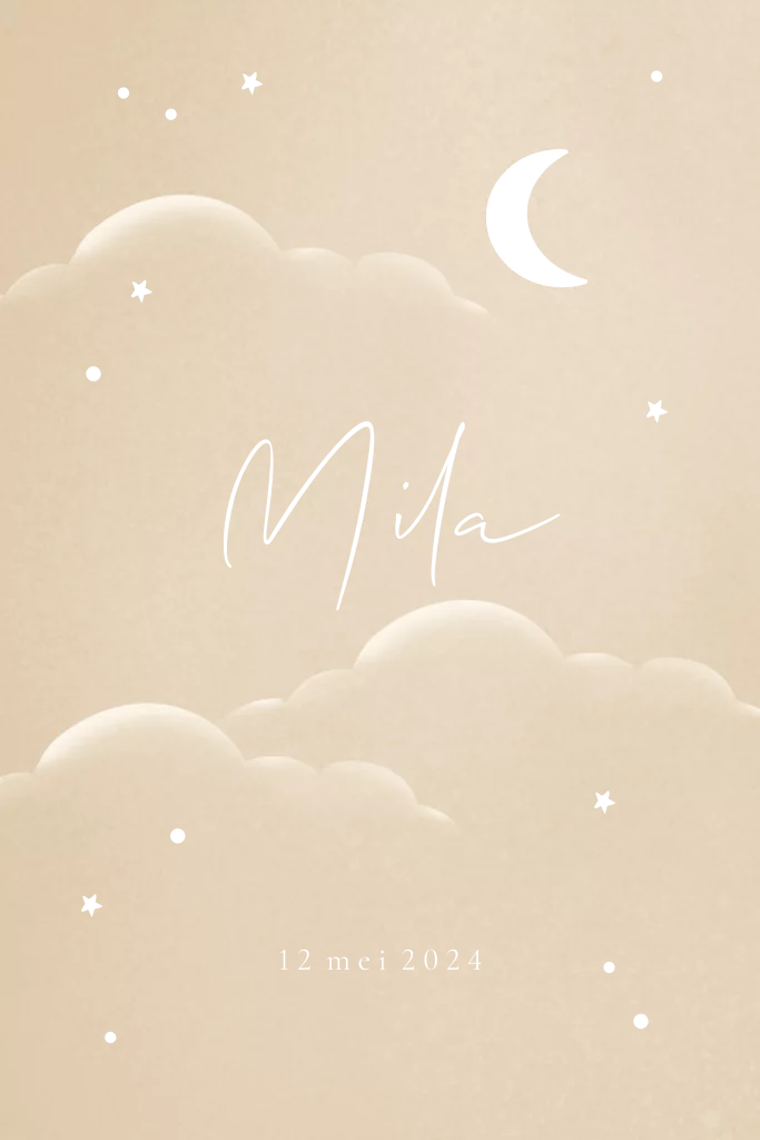 Een mooi geboortekaartje met geverfde wolkjes en foliedruk sterren en maan. Kleuren en tekst kunnen gewijzigd worden.