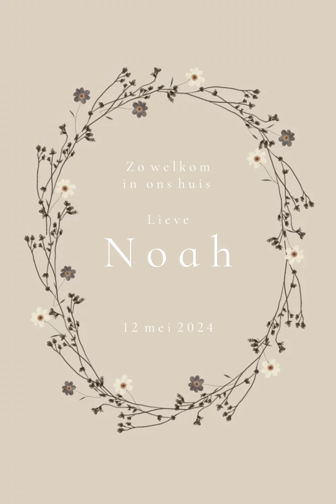 Tekst kan gewijzigd worden. Dit kaartje met foliedruk, en heeft een krans van takjes en lieve kleine bloemetjes.