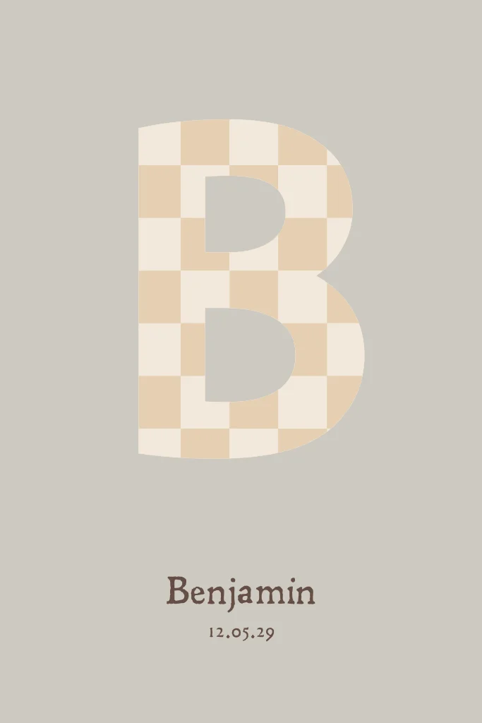 Op zoek naar een uniek geboortekaartje voor je kleintje? Dan is dit kaartje met de eerste letter van de naam van je kindje met een blokruit in zand kleuren. In onze collectie zijn alle letters van het alfabet te vinden in verschillende designs.