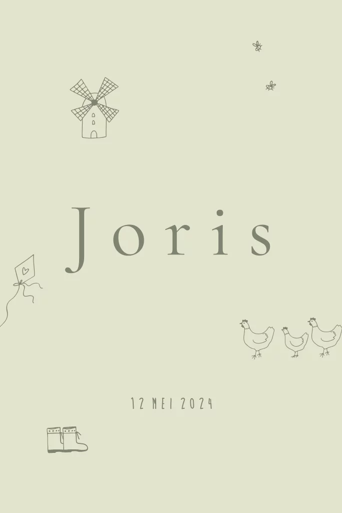 Een mooi eenvoudig geboortekaartje met lijn illustraties in een holland thema in naturel kleuren. Kleuren en tekst kunnen gewijzigd worden.