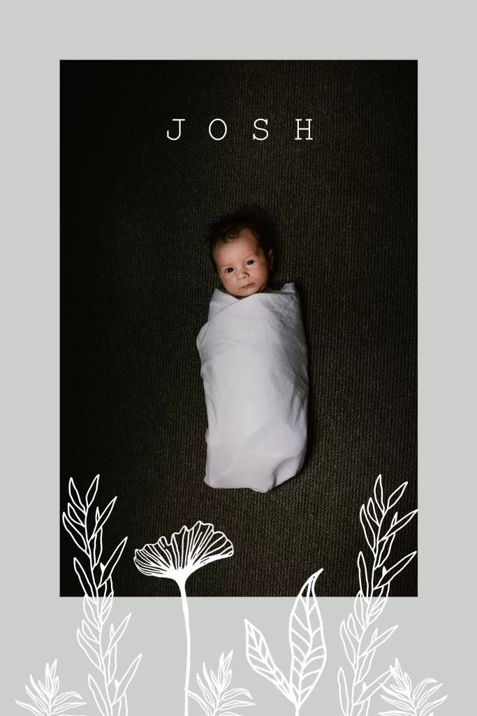 Een lief eenvoudig geboortekaartje met een bloemen rand en getekende bloemen en blaadjes. Plaats de foto achter de bloemen rand.