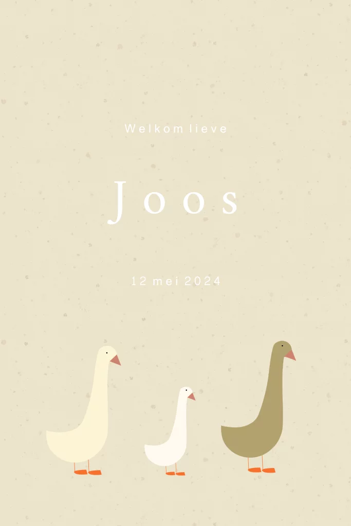 Mooie geboortekaartjes met gansjesfamilie voor je zoon of dochter. De kleuren en tekst kunnen worden aangepast. Onze geboortekaartjes met gansjesfamilie zijn uniek en een echte eye-catcher. Je kunt de kleuren en tekst aanpassen, zodat het kaartje perfect bij je past. De kaartjes zijn gemaakt van hoogwaardig materiaal en zullen zeker indruk maken op je vrienden en familie.
