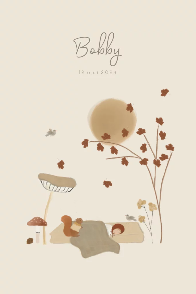 Een leuk geboortekaartje met ruitjes patroon en getekende fantasie illustratie, een baby in de herfst. Achtergrond kleuren en tekst kan je wijzigen.