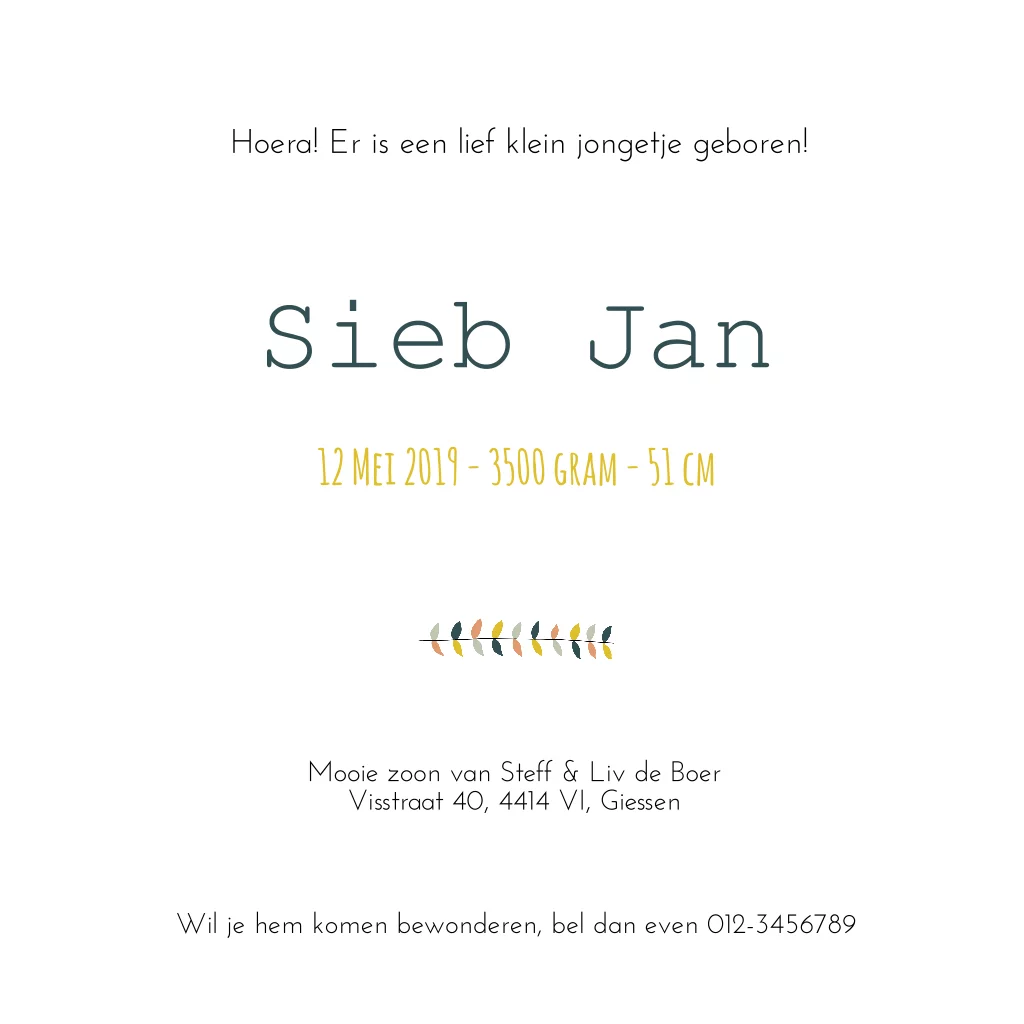 Een lief geboortekaartje met blaadjes. en een mogelijkheid voor een eigen foto. Een geboortekaartje in warme kleuren, deze is ook te bestellen in een ander formaat. Heb je vragen? mail ons gerust.