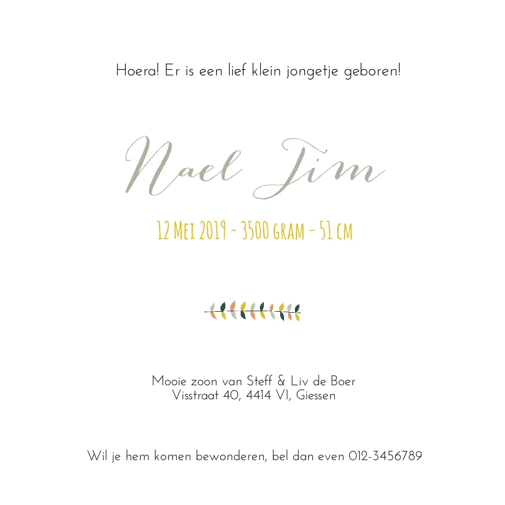 Een lief geboortekaartje met blaadjes. Een geboortekaartje in warme kleuren, deze is ook te bestellen in een ander formaat. Heb je vragen? mail ons gerust.