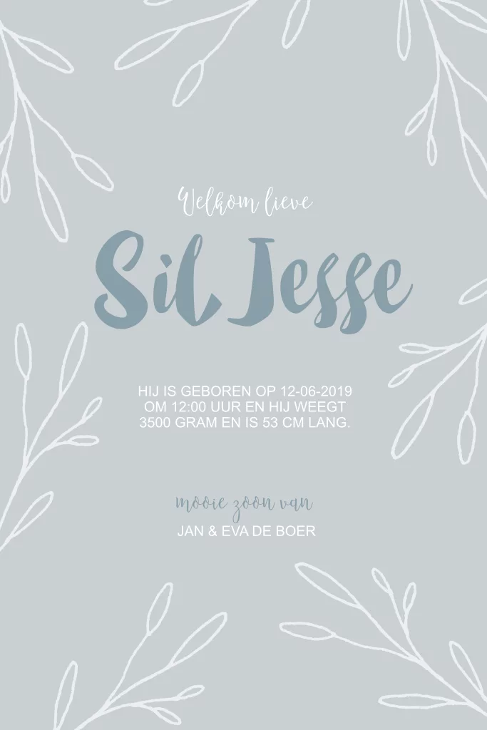 Een lief eenvoudig geboortekaartje met blaadjes. De kleuren kunnen allemaal aangepast worden. Vragen? Mail ons gerust.