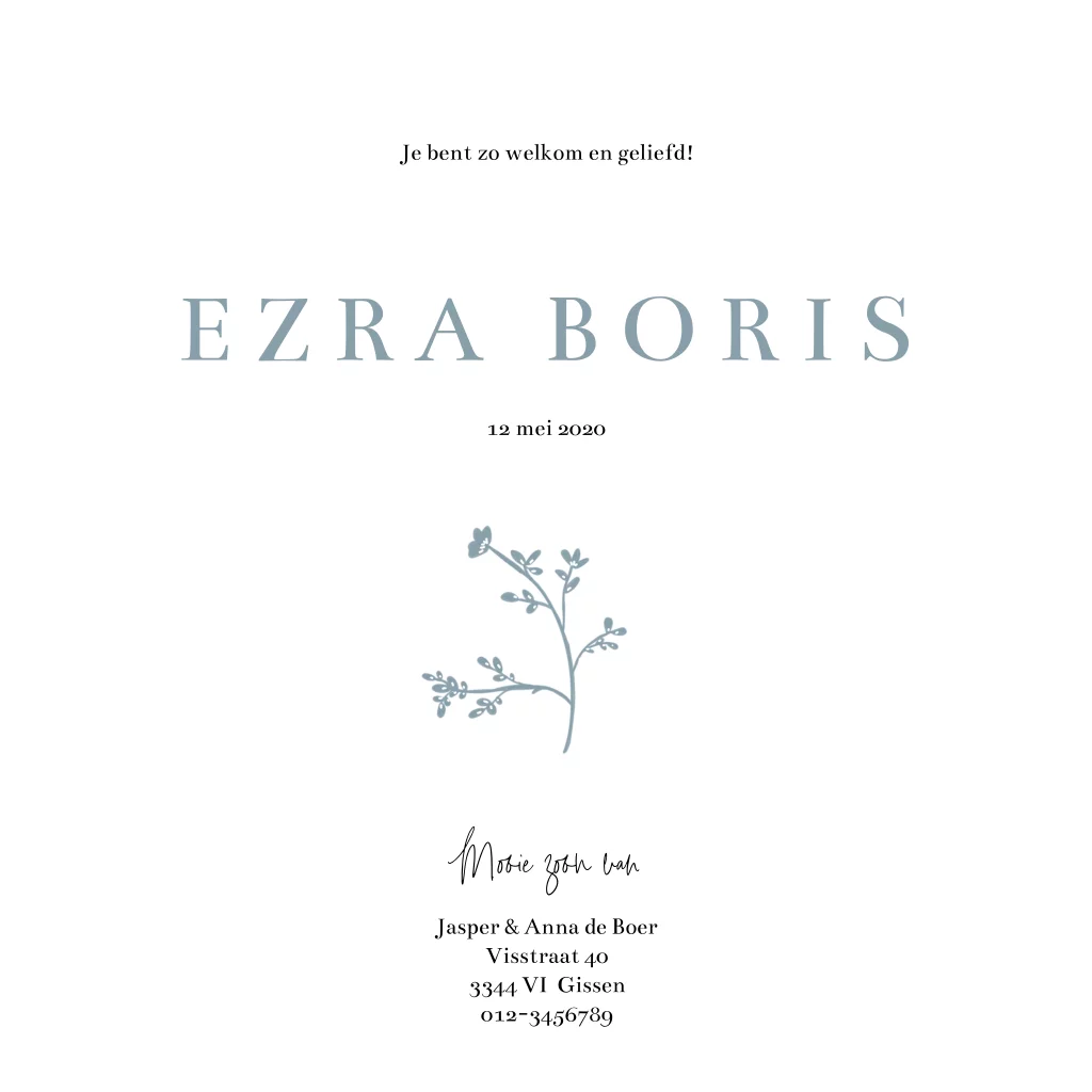 Een heel lief eenvoudig geboortekaartje met een takje, aan de binnenkant de mogelijkheid voor een eigen foto.