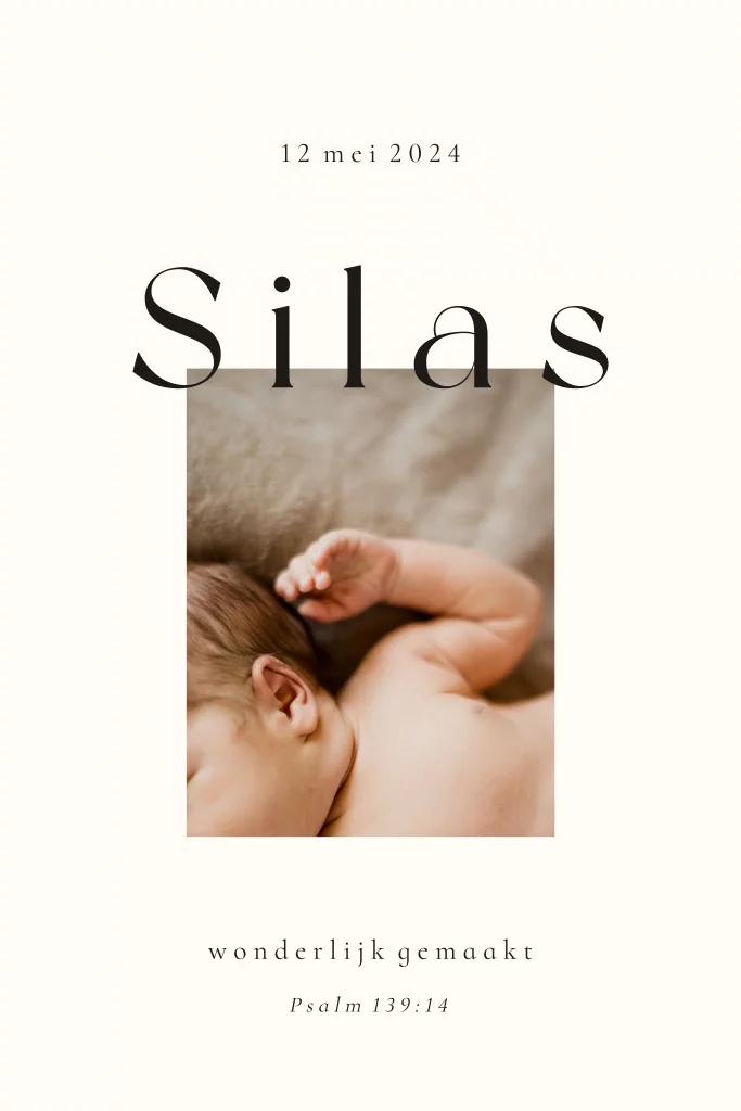 Op zoek naar een uniek en minimalistisch geboortekaartje om de komst van jullie kindje aan te kondigen? Ontdek ons prachtige geboortekaartje met een warme en liefdevolle uitstraling. Dit mooie ontwerp is perfect voor ouders die op zoek zijn naar een stijlvolle en persoonlijke manier om de geboorte van hun kindje te vieren. Dit kaartje is voorzien van een mooie christelijke tekst. Onze geboortekaartjes zijn volledig aanpasbaar, zodat jullie de tekst en kleuren naar wens kunnen personaliseren. Of jullie nu de voorkeur geven aan zachte aquarel tinten, rustieke vintage elementen of een meer illustratieve stijl, wij zorgen ervoor dat het kaartje perfect aansluit bij jullie wensen. Met duurzaam papier en een clean design, is dit geboortekaartje niet alleen stijlvol, maar ook milieuvriendelijk. Of het nu voor jullie dochter, zoon of een tweeling is, dit kaartje is geschikt voor elke gelegenheid. Kies voor een geboortekaartje met foto om een persoonlijk tintje toe te voegen, of ga voor een rustig en tijdloos ontwerp met een kader in zwart, beige of geel. Onze geboortekaartjes zijn ook perfect te gebruiken als huwelijksuitnodiging of voor speciale feestdagen. Laat jullie liefde stralen met ons minimalistische geboortekaartje en deel dit bijzondere moment met jullie dierbaren. Met onze uitgebreide personalisatiemogelijkheden zorgen wij ervoor dat jullie aankondiging van de geboorte van jullie kindje perfect past bij jullie unieke verhaal.