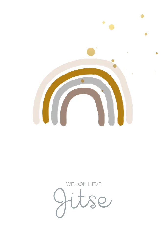Een lief eenvoudig regenboog stippen geboortekaartje. De stippen zijn in goud look en de achtergrond van het kaartje kan je van kleur veranderen.