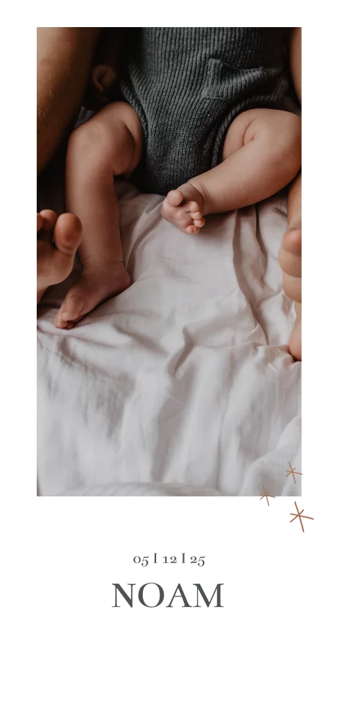 Een hip en trendy geboortekaartje met sterretjes. De tekst en kleuren kunnen worden aangepast en de foto kan gewijzigd worden.
