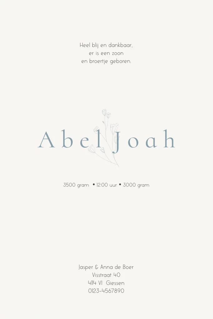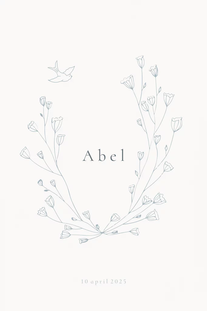 Een mooi dubbel geboortekaartje met een krans van takjes en een vogeltje. Kleuren kunnen gewijzigd worden.
