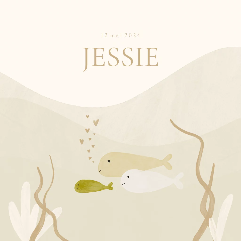 Een mooi unisex geboortekaartje met een onderwater wereld en visjes in naturel kleuren. Is jullie gezinssamenstelling anders? Plak er een visje bij.