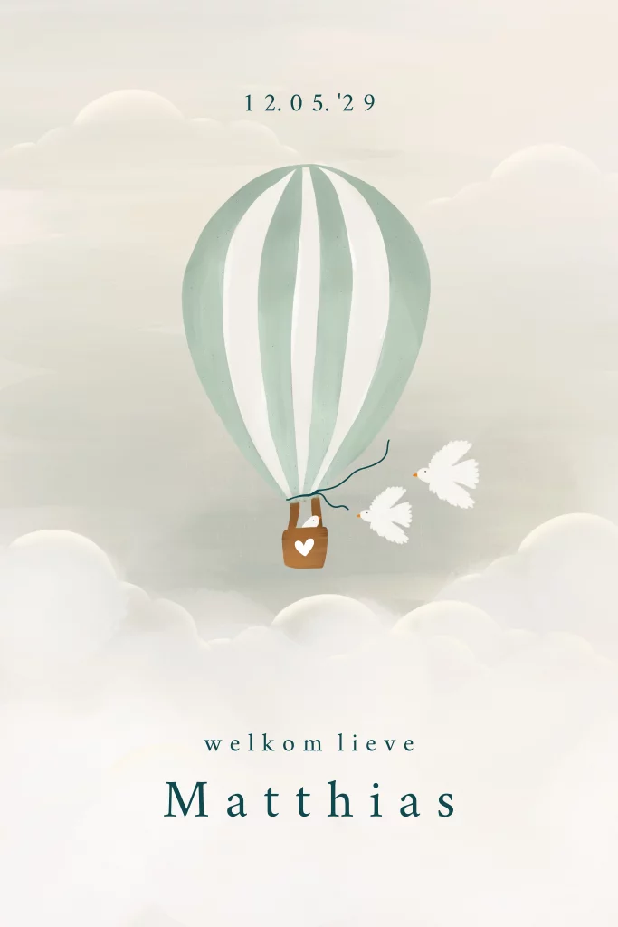 Onze prachtige collectie geboortekaartjes omvat het betoverende Geboortekaartje met een luchtballon en wolkjes. Dit lieflijke, romantische en minimalistische geboortekaartje is perfect voor de aankondiging van de komst van jullie kleine wonder. De afbeelding van de luchtballon voegt een vleugje speelsheid toe aan het kaartje, terwijl de zachte kleuren en de aquarel wolkjes een gevoel van tederheid en sereniteit oproepen.