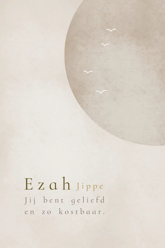 Een mooi minimalistisch geboortekaartje, met een watercolor zon, achtergrond en vogels.