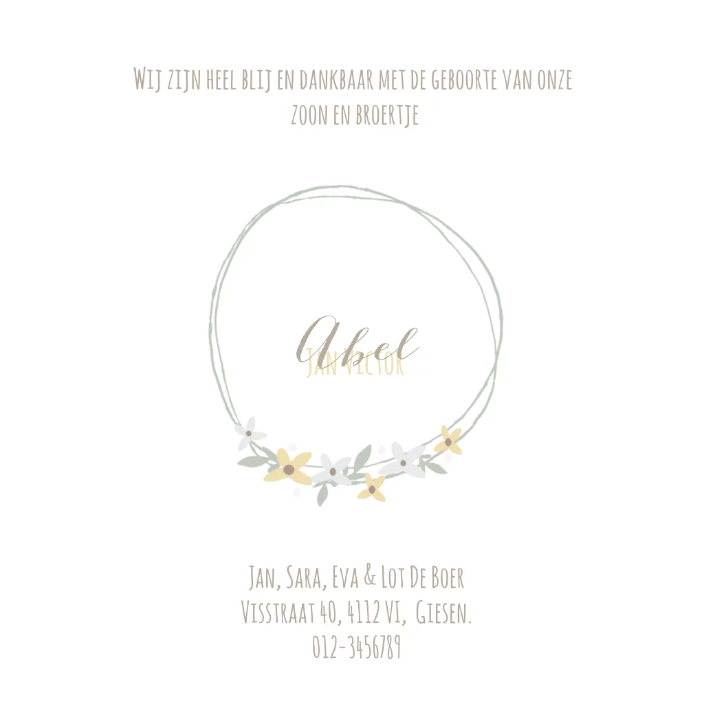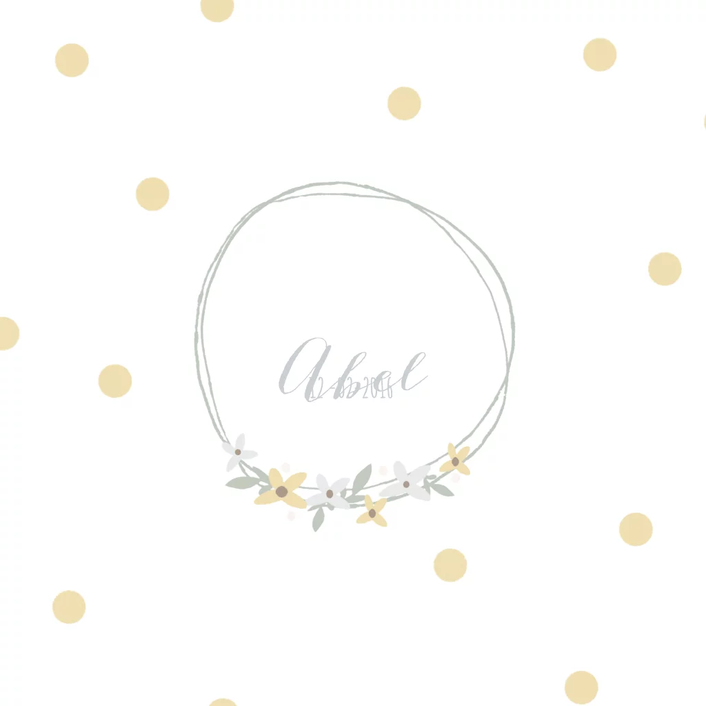 Een lief geboortekaartje, met een krans met bloemetjes en een stippen achtergrond. In de kleuren, licht grijs, mosterd, lichtblauw, oud groen. Als je iets wilt veranderen of bijvoegen en het lukt niet, mail ons dan!