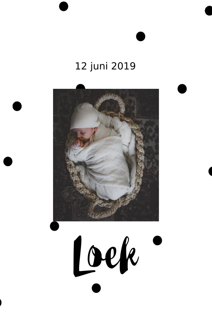 Een lief staand geboortekaartje, met stippen en een label in het zwart wit. Verander gerust de kleur en tekst op het kaartje, zodat het kaartje helemaal naar wens is.