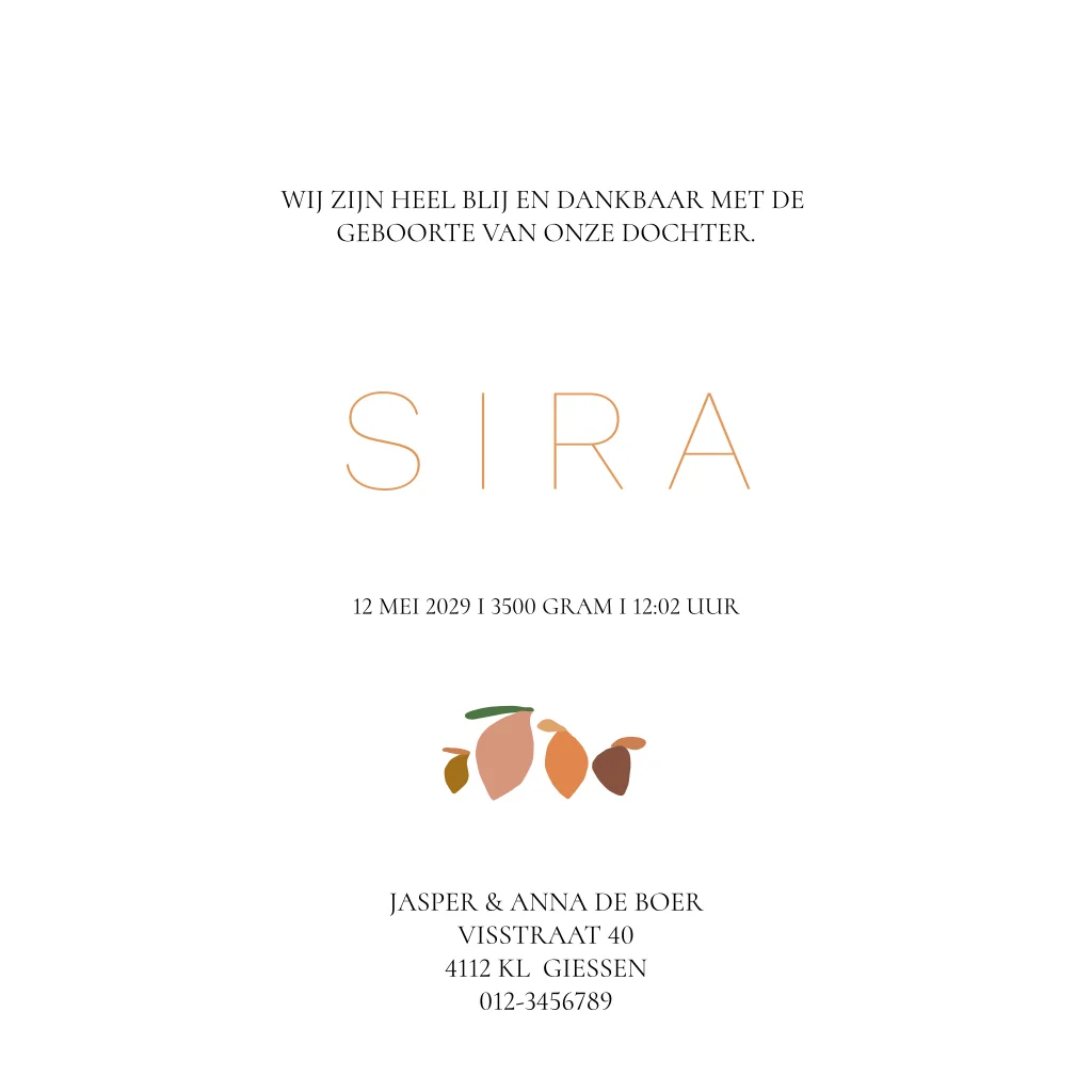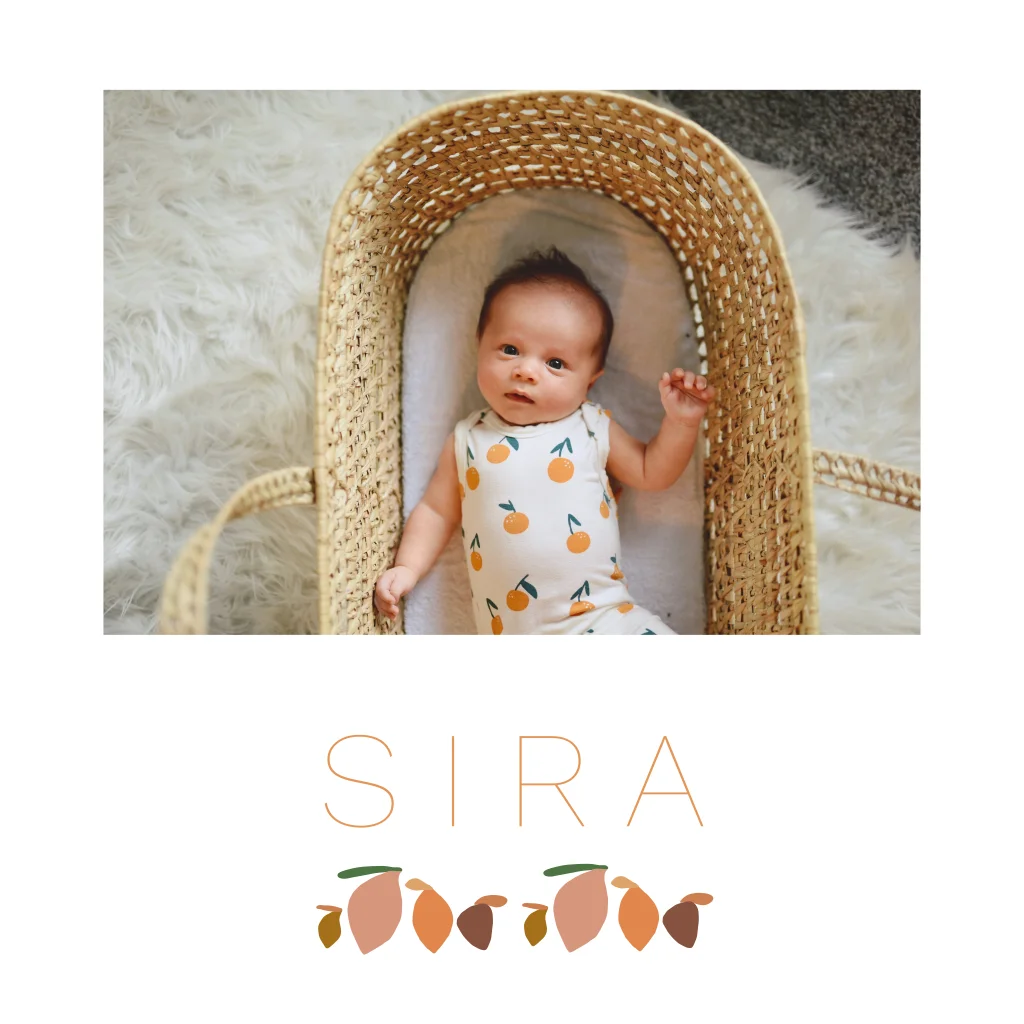 Een stoer geboortekaartje met fruit en de mogelijkheid voor een eigen foto. Kleuren van de tekst en de achtergrond kunnen gewijzigd worden. Heb je vragen? mail ons gerust.
