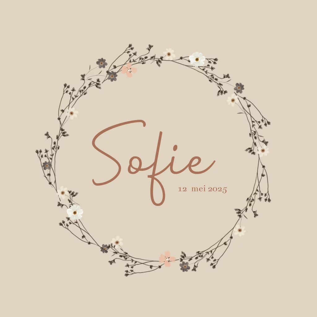 Een mooi geboortekaartje met een krans van takjes en lieve kleine bloemetjes.